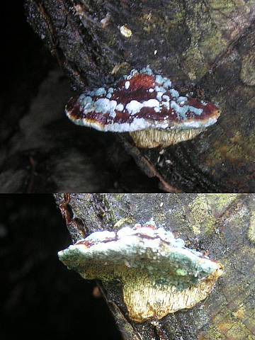 傘:直径4~10cm程で厚さ2~5cm程の中型~大型、半円形~扇形~丸山形で鈍縁。表面は幼時に強い粘性があり淡黄土色、成長すると乾き茶褐色~黄褐色で周縁は淡黄土色、小さな瘤状の凸凹がある。