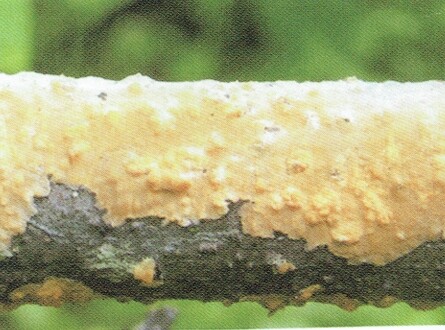 子実体は厚さ0.2-0.3mmの膜状で樹皮の表面に小さな斑点状で発生~成長して隣接と接触すると結合し、大きく不定形に広がる。