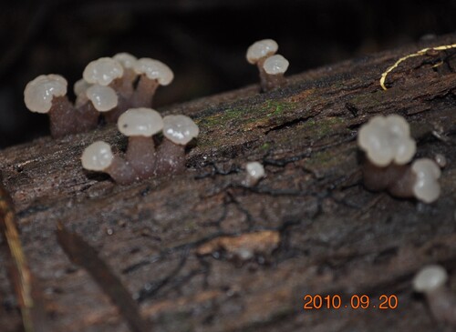 小型菌「偽頭巾茸」和名。ニセズキンタケにいくつかの種類があるようで特徴がやや異なりますが、同定に悩む