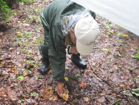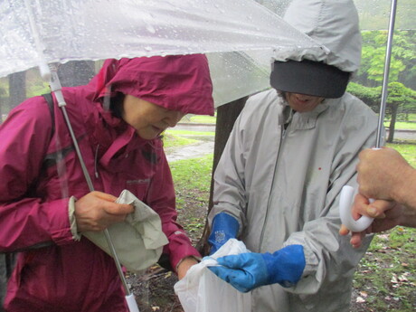 当日は午前中が雨で午後は止むとの予報でしたので、前日から澄川地区連合会の役員さんとお電話で打ち合わせを行い、再度、明日朝7時に検討することとして当日を迎えました。7時頃は小雨でしたので傘をさしてやりましょう!!そのうちに雨も止むでしょう?とのことで実施した次第です。私も入れて5名で1時間弱、傘をさして林内に入りました。ツルタケ、キヌガサトマヤタケ、ハンノキイグチ、虫食いのシメジの仲間、モリノカレバタケなどを解説しました。(紀 中田洋子)