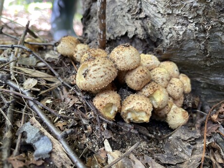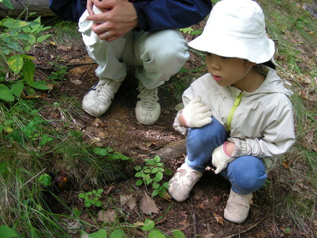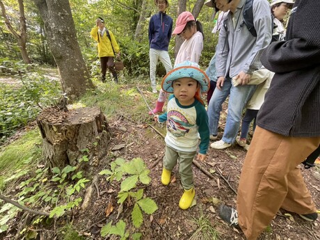 少し汗ばむが気持ちの良い秋晴れの中、親子キノコ観察会が開催された。B班は清水目さんをリーダーに、子どもたちを含めて総勢17名で出発した。遊歩道と両脇の地面は乾燥しており、初めのうちはあまりキノコの姿を見かけなかったが、参加していた子どもたちは意欲的で、最初にきのこを発見したのも小学校中学年位の女の子だった。それは直径1センチほどの赤茶色の小さな傘だけ地上に出ていたラクヨウキノコだった。よく見るとその周りにもぽつぽつと同じくらいの大きさのラクヨウキノコが出ていた。その後もやはりまだ小さいラクヨウキノコが見つかり、この公園のラクヨウキノコはこれからが本番を迎えるのだろうと思った。子どもたちはその後も意欲的にキノコ探しをし、ナメクジがキノコについているのを見つけて驚きの声をあげ逃げる子もいれば興味深く見る子もいてにぎやかな観察散歩が続いた。最後の方では白樺林の中でポルチーニ茸やキンチャヤマイグチも見つかり楽しい観察会になった。(佐藤真弓 記)