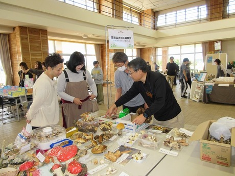 我が藻岩山キノコ観察会は松原が採集したキノコを持ち寄り展示しました。その数なんと昨年と同様36種類でした。特に巨大化したテングタケはひときわ目を引き、初めて見たと驚いていました。また、キノコの生態についての質問があつたり、旬のハナイグチやナラタケを熱心に見たりしていました。