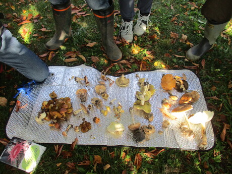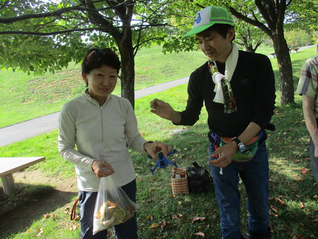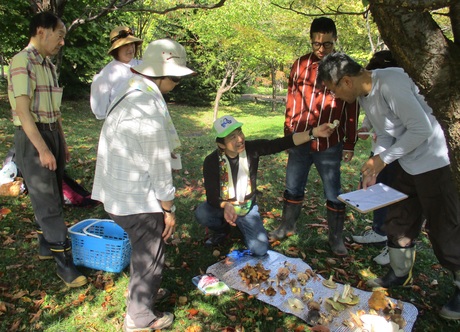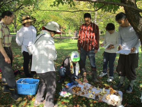 4日午前はA班の活動に参加にて、午後遅くにEメールを開くと、Sさんから「明日5日のきのこ定例観察会の会場ですが、宮ヶ丘公園が閉鎖になったと報じられていましたが、どうしますか?・・自分の意見ですが、今年最後ですし緊急事態ですので、他の班の開催もありますが解りやすい会場ということで、同時刻で先週と同じ旭山公園の開催はどうでしょうか?天気も良いので中止とするのはもったいないと思いますがいかがでしょうか。」とのメールが入っておりましたので、Oさんと相談と思ってお電話したところ「そうだね、Sさんの言うようにお天気も良いようですし、また今年最後ですのでやりましょう!!」とのご返事でしたので、日頃ご参加下さっているB班員に「急遽のことですがと・・・」お電話して、旭山記念公園で実施となりました。9時に森の家前に8名が集合しましたが、来ると言っていたYさんが未だ来ていないので、お電話しようと思って携帯を探すが無い!!落としたのか? さて? Kさんの車で我が家に戻ったら、玄関に置いてありました。ご迷惑をおかけしてのスタートとなりましたが、昨日のA班でのきのこ観察実施の翌日でしたが、美味しいハナイグチ、シロヌメリイグチ、ヤマイグチ、キンチャヤマイグチ、ポルチーニと言われるヤマドリタケモドキなどの食べられるきのこが発生していました。参加者:9名。同定:23種類。きのこ採集一覧表記載者:清水目賢治。きのこ解説者:清水目賢治、中田洋子。(中田洋子 記)